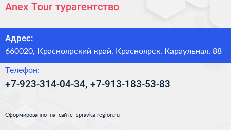 Anex Tour, турагентство по адресу 660020, Красноярский край, Красноярск, Караульная, 88 в дальнейшем Организация, размещена в следующих категориях: