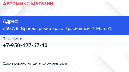 Автомикс, магазин по адресу 660098, Красноярский край, Красноярск, 9 Мая, 73 в дальнейшем Организация, размещена в следующих категориях: