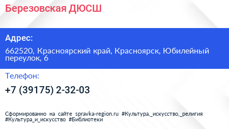 Березовская ДЮСШ по адресу 662520, Красноярский край, Красноярск, Юбилейный переулок, 6 в дальнейшем Организация, размещена в следующих категориях: