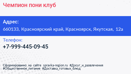 Чемпион, пони-клуб по адресу 660133, Красноярский край, Красноярск, Якутская, 12а в дальнейшем Организация, размещена в следующих категориях: