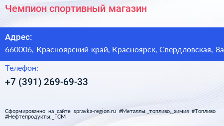 Чемпион, спортивный магазин по адресу 660006, Красноярский край, Красноярск, Свердловская, 8а в дальнейшем Организация, размещена в следующих категориях: