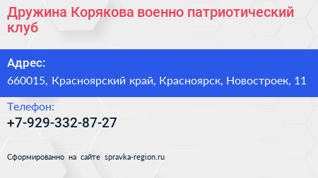 Дружина Корякова, военно-патриотический клуб по адресу 660015, Красноярский край, Красноярск, Новостроек, 11 в дальнейшем Организация, размещена в следующих категориях: