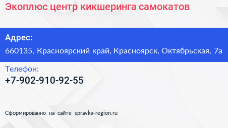 Экоплюс, центр кикшеринга самокатов по адресу 660135, Красноярский край, Красноярск, Октябрьская, 7а в дальнейшем Организация, размещена в следующих категориях: