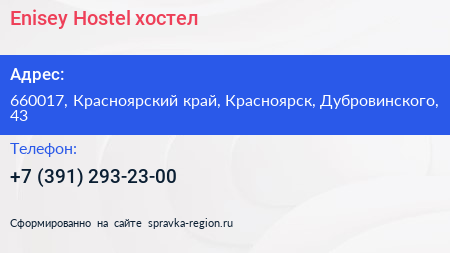 Enisey Hostel, хостел по адресу 660017, Красноярский край, Красноярск, Дубровинского, 43 в дальнейшем Организация, размещена в следующих категориях: