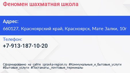 Феномен, шахматная школа по адресу 660127, Красноярский край, Красноярск, Мате Залки, 10г в дальнейшем Организация, размещена в следующих категориях: