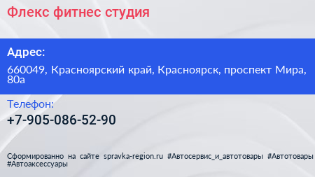 Флекс, фитнес-студия по адресу 660049, Красноярский край, Красноярск, проспект Мира, 80а в дальнейшем Организация, размещена в следующих категориях: