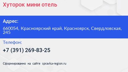 Хуторок, мини-отель по адресу 660054, Красноярский край, Красноярск, Свердловская, 245 в дальнейшем Организация, размещена в следующих категориях: