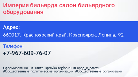 Империя бильярда, салон бильярдного оборудования по адресу 660017, Красноярский край, Красноярск, Ленина, 92 в дальнейшем Организация, размещена в следующих категориях: