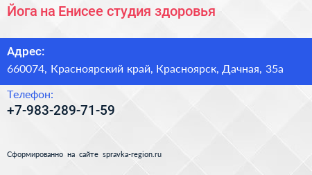 Йога на Енисее, студия здоровья по адресу 660074, Красноярский край, Красноярск, Дачная, 35а в дальнейшем Организация, размещена в следующих категориях: