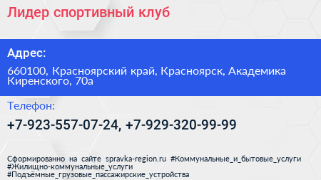 Лидер, спортивный клуб по адресу 660100, Красноярский край, Красноярск, Академика Киренского, 70а в дальнейшем Организация, размещена в следующих категориях: