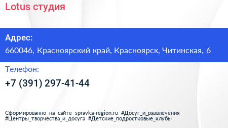 Lotus, студия по адресу 660046, Красноярский край, Красноярск, Читинская, 6 в дальнейшем Организация, размещена в следующих категориях: