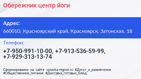Обережник, центр йоги по адресу 660010, Красноярский край, Красноярск, Затонская, 18 в дальнейшем Организация, размещена в следующих категориях: