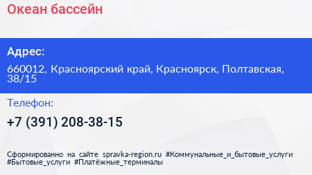 Океан, бассейн по адресу 660012, Красноярский край, Красноярск, Полтавская, 38/15 в дальнейшем Организация, размещена в следующих категориях:
