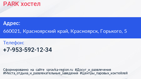 PARK, хостел по адресу 660021, Красноярский край, Красноярск, Горького, 5 в дальнейшем Организация, размещена в следующих категориях: