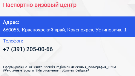 Паспортно-визовый центр по адресу 660055, Красноярский край, Красноярск, Устиновича, 1 в дальнейшем Организация, размещена в следующих категориях: