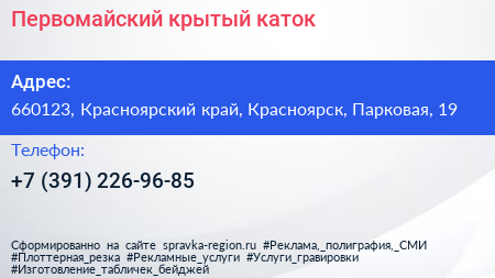 Первомайский, крытый каток по адресу 660123, Красноярский край, Красноярск, Парковая, 19 в дальнейшем Организация, размещена в следующих категориях: