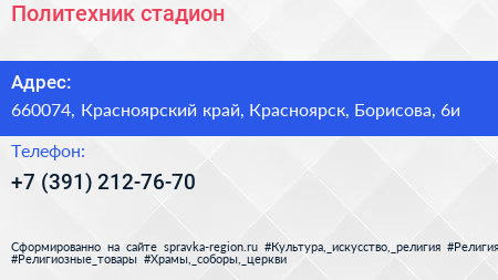 Политехник, стадион по адресу 660074, Красноярский край, Красноярск, Борисова, 6и в дальнейшем Организация, размещена в следующих категориях: