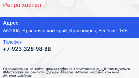 Ретро, хостел по адресу 660006, Красноярский край, Красноярск, Весёлая, 16Б в дальнейшем Организация, размещена в следующих категориях: