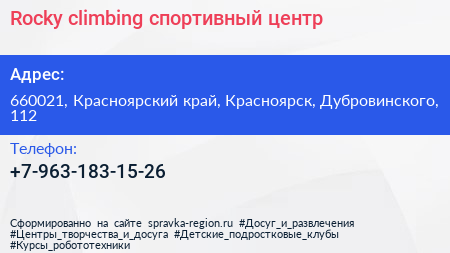 Rocky climbing, спортивный центр по адресу 660021, Красноярский край, Красноярск, Дубровинского, 112 в дальнейшем Организация, размещена в следующих категориях: