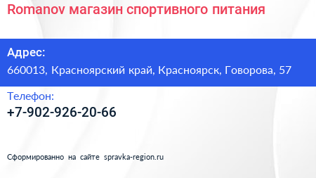 Romanov, магазин спортивного питания по адресу 660013, Красноярский край, Красноярск, Говорова, 57 в дальнейшем Организация, размещена в следующих категориях:
