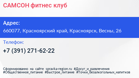 САМСОН, фитнеc-клуб по адресу 660077, Красноярский край, Красноярск, Весны, 26 в дальнейшем Организация, размещена в следующих категориях: