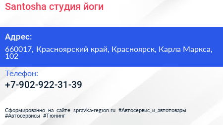 Santosha, студия йоги по адресу 660017, Красноярский край, Красноярск, Карла Маркса, 102 в дальнейшем Организация, размещена в следующих категориях: