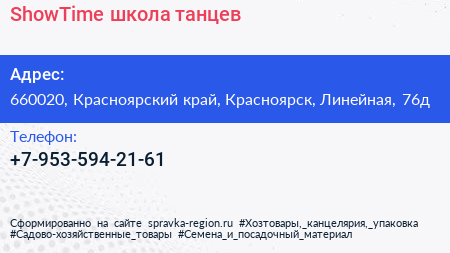 ShowTime, школа танцев по адресу 660020, Красноярский край, Красноярск, Линейная, 76д в дальнейшем Организация, размещена в следующих категориях: