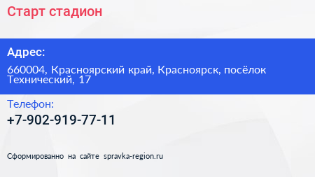 Старт, стадион по адресу 660004, Красноярский край, Красноярск, посёлок Технический, 17 в дальнейшем Организация, размещена в следующих категориях: