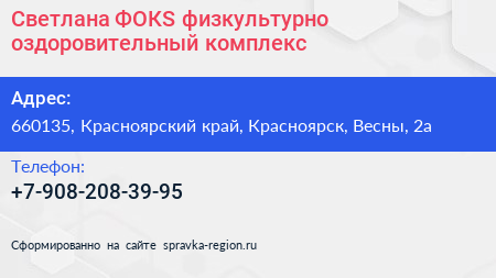 Светлана ФОКS, физкультурно-оздоровительный комплекс по адресу 660135, Красноярский край, Красноярск, Весны, 2а в дальнейшем Организация, размещена в следующих категориях: