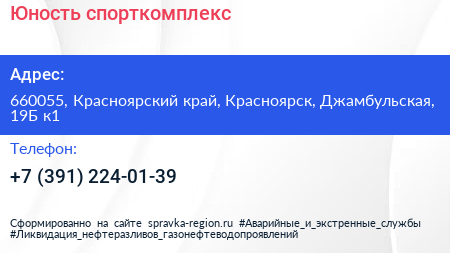 Юность, спорткомплекс по адресу 660055, Красноярский край, Красноярск, Джамбульская, 19Б к1 в дальнейшем Организация, размещена в следующих категориях:
