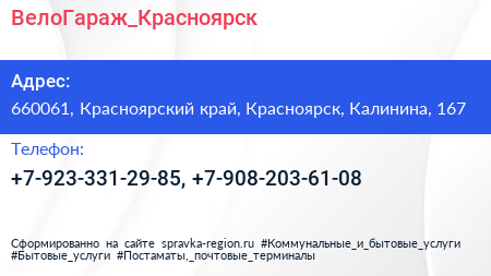 ВелоГараж_Красноярск по адресу 660061, Красноярский край, Красноярск, Калинина, 167 в дальнейшем Организация, размещена в следующих категориях: