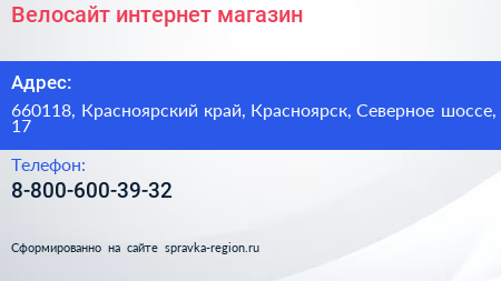 Велосайт, интернет-магазин по адресу 660118, Красноярский край, Красноярск, Северное шоссе, 17 в дальнейшем Организация, размещена в следующих категориях: