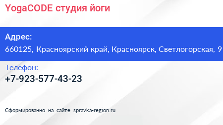 YogaCODE, студия йоги по адресу 660125, Красноярский край, Красноярск, Светлогорская, 9 в дальнейшем Организация, размещена в следующих категориях: