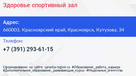 Здоровье, спортивный зал по адресу 660003, Красноярский край, Красноярск, Кутузова, 34 в дальнейшем Организация, размещена в следующих категориях: