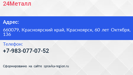 24Металл по адресу 660079, Красноярский край, Красноярск, 60 лет Октября, 136 в дальнейшем Организация, размещена в следующих категориях: