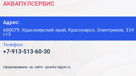 АКВАПУЛСЕРВИС по адресу 660079, Красноярский край, Красноярск, Электриков, 154 ст3 в дальнейшем Организация, размещена в следующих категориях: