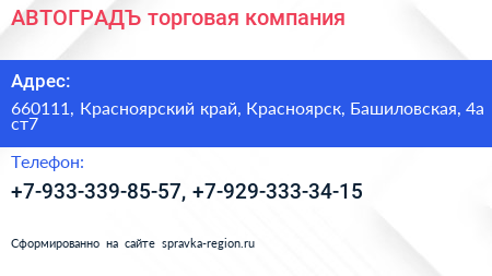 АВТОГРАДЪ, торговая компания по адресу 660111, Красноярский край, Красноярск, Башиловская, 4а ст7 в дальнейшем Организация, размещена в следующих категориях: