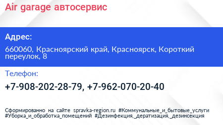Air garage, автосервис по адресу 660060, Красноярский край, Красноярск, Короткий переулок, 8 в дальнейшем Организация, размещена в следующих категориях: