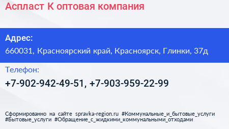 Аспласт-К, оптовая компания по адресу 660031, Красноярский край, Красноярск, Глинки, 37д в дальнейшем Организация, размещена в следующих категориях: