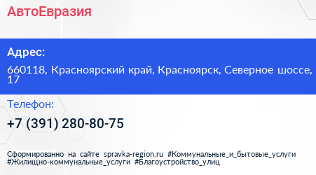 АвтоЕвразия по адресу 660118, Красноярский край, Красноярск, Северное шоссе, 17 в дальнейшем Организация, размещена в следующих категориях: