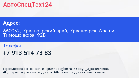 АвтоСпецТех124 по адресу 660052, Красноярский край, Красноярск, Алёши Тимошенкова, 92Б в дальнейшем Организация, размещена в следующих категориях: