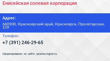 Енисейская солевая корпорация по адресу 660100, Красноярский край, Красноярск, Пролетарская, 159 в дальнейшем Организация, размещена в следующих категориях:
