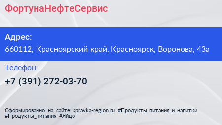 ФортунаНефтеСервис по адресу 660112, Красноярский край, Красноярск, Воронова, 43а в дальнейшем Организация, размещена в следующих категориях: