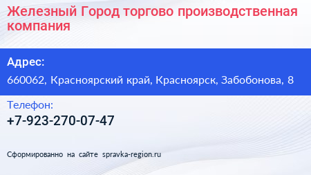 Железный Город, торгово-производственная компания по адресу 660062, Красноярский край, Красноярск, Забобонова, 8 в дальнейшем Организация, размещена в следующих категориях: