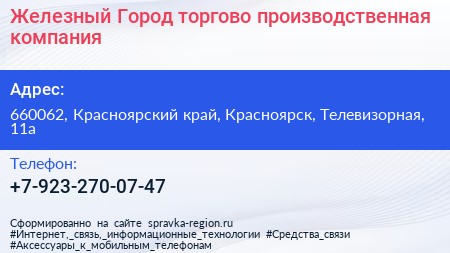 Железный Город, торгово-производственная компания по адресу 660062, Красноярский край, Красноярск, Телевизорная, 11а в дальнейшем Организация, размещена в следующих категориях: