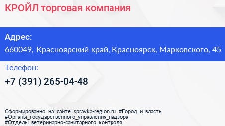 КРОЙЛ, торговая компания по адресу 660049, Красноярский край, Красноярск, Марковского, 45 в дальнейшем Организация, размещена в следующих категориях: