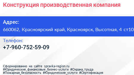Конструкция, производственная компания по адресу 660062, Красноярский край, Красноярск, Высотная, 4 ст10 в дальнейшем Организация, размещена в следующих категориях: