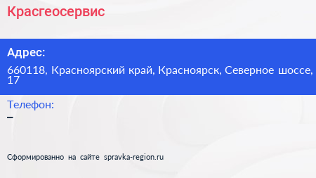 Красгеосервис по адресу 660118, Красноярский край, Красноярск, Северное шоссе, 17 в дальнейшем Организация, размещена в следующих категориях: