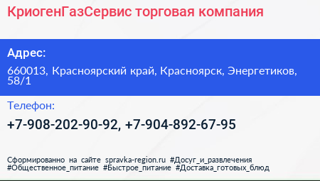 КриогенГазСервис, торговая компания по адресу 660013, Красноярский край, Красноярск, Энергетиков, 58/1 в дальнейшем Организация, размещена в следующих категориях: