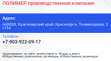 ПОЛИМЕР, производственная компания по адресу 660028, Красноярский край, Красноярск, Телевизорная, 1 ст16 в дальнейшем Организация, размещена в следующих категориях: